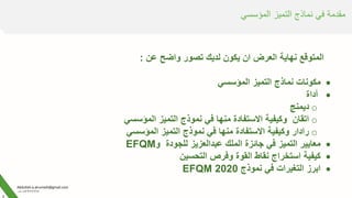 تقدم الوثيقة تصورًا عن نماذج التميز المؤسسي، مع التركيز على مكوناته وأدوات القياس مثل نموذج ديمنج. تتضمن أيضًا معايير عبدالعزيز الملك لجائزة التميز وأهمية تحسين الأداء المؤسسي. تستعرض الوثيقة أيضًا الفوائد والنقاط القوية ونماذج التقييم المستخدمة في تحقيق التميز المؤسسي.