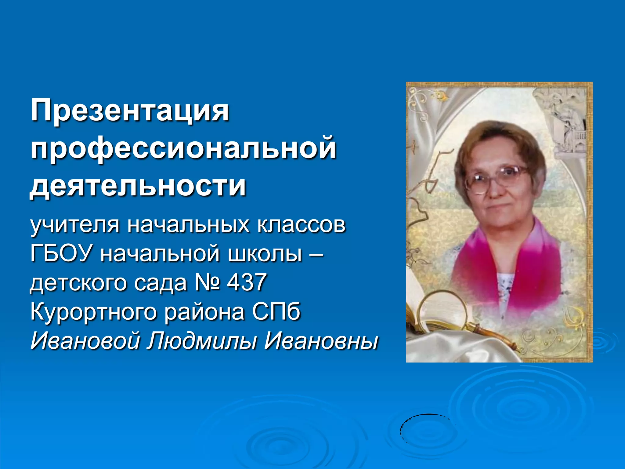 Документ представляет собой презентацию профессиональной деятельности учителя начальных классов Людмилы Ивановны Ивановой, которая имеет 35-летний стаж работы и высшую категорию с 2004 года. Она акцентирует внимание на своей педагогической деятельности, основным принципом которой является проекто-исследовательская работа с детьми. Презентация также включает информацию о её образовании, профессиональном развитии и наградах, а также о курсах повышения квалификации.