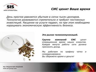 Группа компаний СИС предоставляет комплексные телекоммуникационные услуги с 1996 года, включая проектирование и строительство волоконно-оптических и медных сетей, а также организацию доступа по современным технологиям. Основное внимание уделяется минимизации простоя сетей клиентов, поскольку каждая минута простоя может приводить к значительным финансовым потерям. Компания имеет опыт работы с крупными операторами в Беларуси и Молдове, обеспечивая высокую квалификацию и качество услуг.