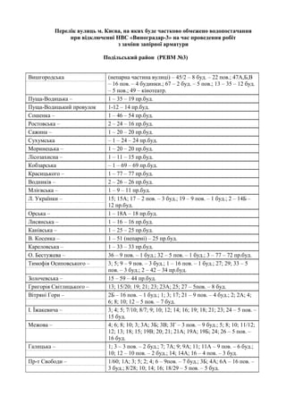 Києва, на яких буде частково обмежено водопостачання при відключенні НВС «Виноградар-3» на час проведення робіт з заміни запірної арматури Подільський район (РЕВМ №3) Вишгородська (непарна частина вулиці) – 45/2 – 8 буд. – 22 пов.; 47А,Б,В – 16 пов. – 4 будинки.; 67 – 2 буд. – 5 пов.; 13 – 35 – 12 буд. – 5 пов.; 49 – кінотеатр. Пуща-Водицька – 1 – 35 – 19 пр.буд. Пуща-Водицький провулок 1-12 – 14 пр.буд. Сошенка – 1 – 46 – 54 пр.буд. Ростовська – 2 – 24 – 16 пр.буд. Сажина – 1 – 20 – 20 пр.буд. Сухумська – 1 – 24 – 24 пр.буд. Моринецька – 1 – 20 – 20 пр.буд. Лісозахисна – 1 – 11 – 15 пр.буд. Кобзарська – 1 – 69 – 69 пр.буд. Красицького – 1 – 77 – 77 пр.буд. Водників – 2 – 26 – 26 пр.буд. Млієвська – 1 – 9 – 11 пр.буд. Л. Українки – 15; 15А; 17 – 2 пов. – 3 буд.; 19 – 9 пов. – 1 буд.; 2 – 14Б – 12 пр.буд. Орська – 1 – 18А – 18 пр.буд. Лисянська – 1 – 16 – 16 пр.буд. Канівська – 1 – 25 – 25 пр.буд. В. Косенка – 1 – 51 (непарні) – 25 пр.буд. Кареловська – 1 – 33 – 33 пр.буд. О. Бестужева – 36 – 9 пов. – 1 буд.; 32 – 5 пов. – 1 буд.; 3 – 77 – 72 пр.буд. Тимофія Осиповського – 3; 5; 9 – 9 пов. – 3 буд.; 1 – 16 пов. – 1 буд.; 27; 29; 33 – 5 пов. – 3 буд.; 2 – 42 – 34 пр.буд. Золочевська – 15 – 59 – 44 пр.буд. Григорія Світлицького – 13; 15/20; 19; 21; 23; 23А; 25; 27 – 5пов. – 8 буд. Вітряні Гори – 2Б – 16 пов. – 1 буд.; 1; 3; 17; 21 – 9 пов. – 4 буд.; 2; 2А; 4; 6; 8; 10; 12 – 5 пов. – 7 буд. І. Їжакевича – 3; 4; 5; 7/10; 8/7; 9; 10; 12; 14; 16; 19; 18; 21; 23; 24 – 5 пов. – 15 буд. Межова – 4; 6; 8; 10; 3; 3А; 3Б; 3В; 3Г – 3 пов. – 9 буд.; 5; 8; 10; 11/12; 12; 13; 18; 15; 19В; 20; 21; 21А; 19А; 19Б; 24; 26 – 5 пов. – 16 буд. Галицька – 1; 3 – 3 пов. – 2 буд.; 7; 7А; 9; 9А; 11; 11А – 9 пов. – 6 буд.; 10; 12 – 10 пов. – 2 буд.; 14; 14А; 16 – 4 пов. – 3 буд. Пр-т Свободи – 1/60; 1А; 3; 5; 2; 4; 6 – 9пов. – 7 буд.; 3Б; 4А; 6А – 16 пов. – 3 буд.; 8/28; 10; 14; 16; 18/29 – 5 пов. – 5 буд.