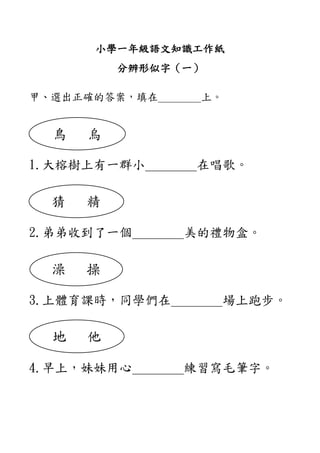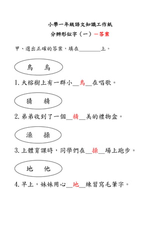 此文档为小学一年级学生设计的语文知识工作纸,主要内容是通过选择正确的词汇来分辨形似字。提供了填空题和参考答案,帮助学生练习识字和理解词义。文中涉及的词汇包括鸟、乌、猜、精、澡、操、地、他等。