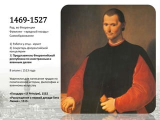 Документ обсуждает проблемы научного понимания общества и человека в творчестве Никколо Макиавелли, акцентируя внимание на его идеях политического реализма и морали. Макиавелли утверждает, что политика должна быть свободна от нравственных норм, подчеркивая важность силы и хитрости для успешного управления. Также рассматриваются взаимоотношения общества и государства, подчеркивая необходимость учета интересов людей при формировании политической практики.