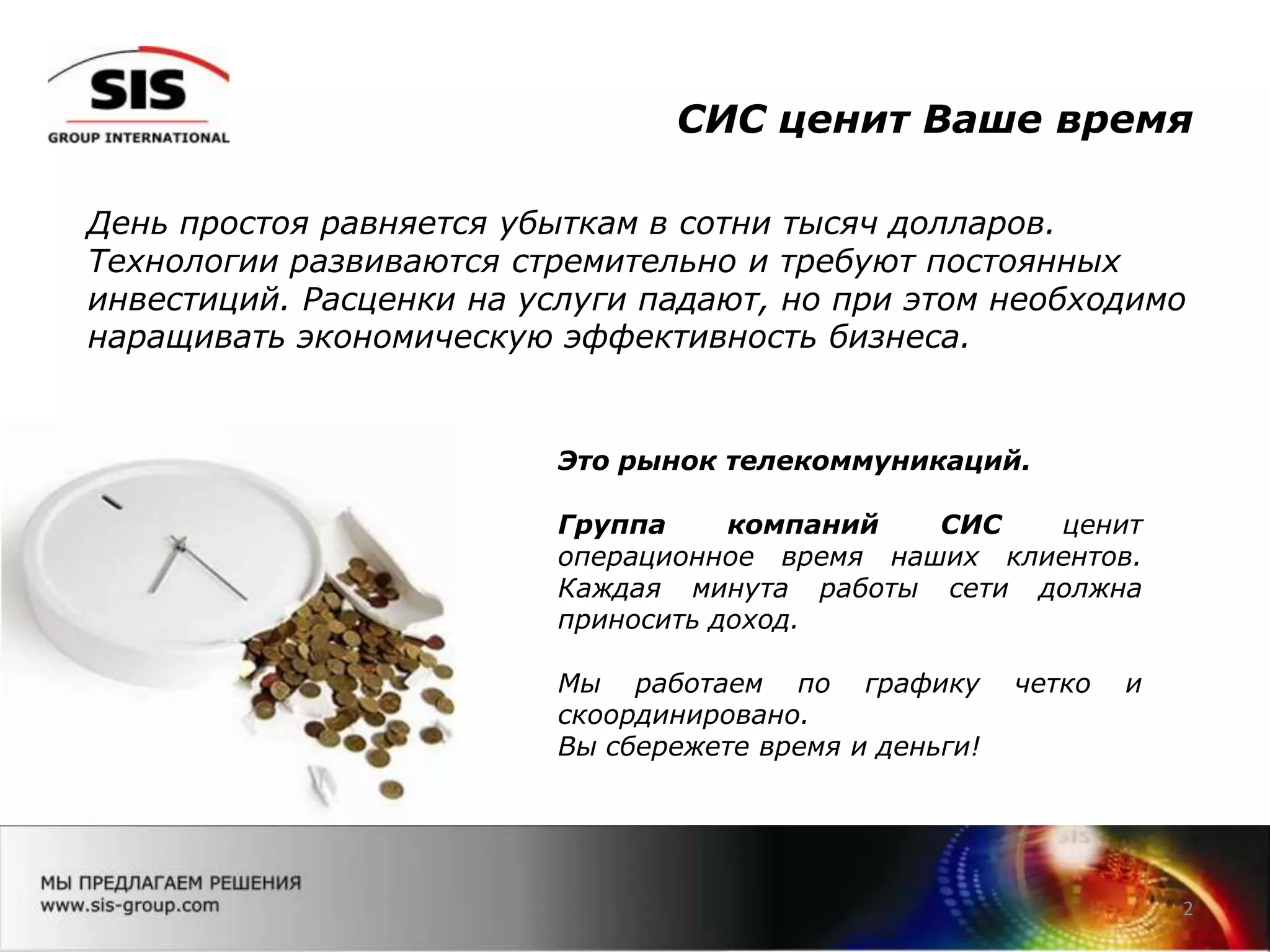 Группа компаний СИС предоставляет услуги в области телекоммуникаций, акцентируя внимание на минимизации простоя сетей для максимизации доходов клиентов. С 1996 года компания осуществляет проектирование, прокладку и модернизацию телекоммуникационных сетей, работая с известными операторами в Беларуси и Молдове. СИС предлагает комплексные решения и имеет 15-летний опыт работы с различными телекоммуникационными компаниями.