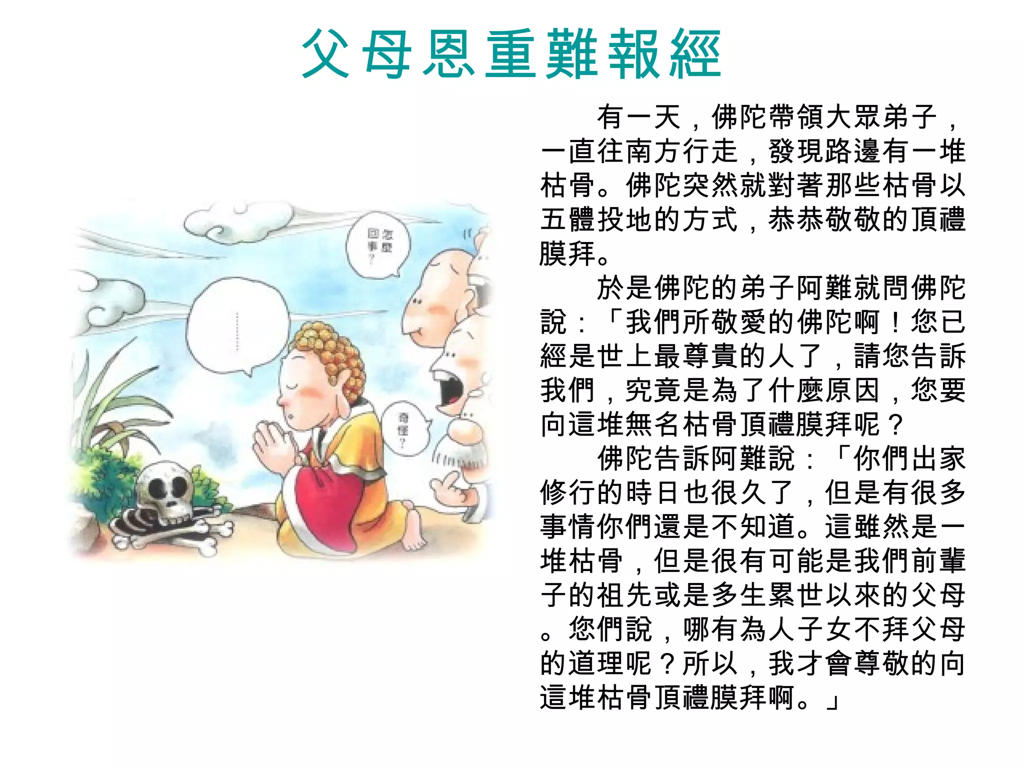 佛陀在一次讲道中向弟子解释了对父母的感恩,强调了母亲在怀孕和分娩中的艰辛,以及父母对孩子无私的爱和牺牲。通过比喻和故事,佛陀指出,尽管子女无法完全报答父母的恩情,但应以尊敬和感激的心态来铭记。最终,弟子们深受感动,意识到自己对父母的忽视,纷纷表示想要反省和改进。