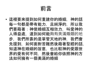 本文件讨论了如何通过圣经重建婚姻,强调在苦难中寻求神的旨意与爱的不同,并提供若干应对婚姻挑战的经文。此外,它探讨了神的爱与世界对爱的理解之间的差异,并指出良好的婚姻生活需要符合神的设计与引导。文末还提供了作者的联络方式和相关资源链接。