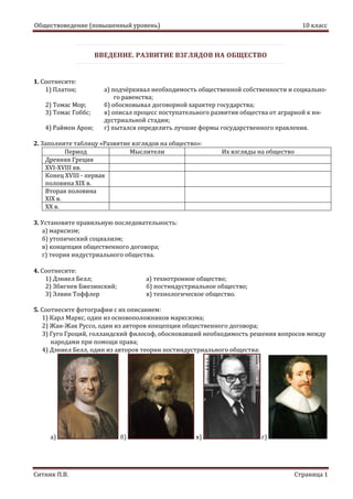 Документ является учебным материалом по обществоведению для 10 класса, посвященным развитию взглядов на общество. В нем представлены задания по соотнесению мыслителей, их взглядов и ключевых концепций, таких как марксизм и постиндустриальное общество. Также включены вопросы, требующие заполнения таблиц и установления правильной последовательности идей.