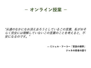 − オンライン授業 − “永遠のなかになお消え去ろうとしているこの言葉、私がおそ らく完全には理解していないこの言葉のことを考えると、不 安になるのです。” ---