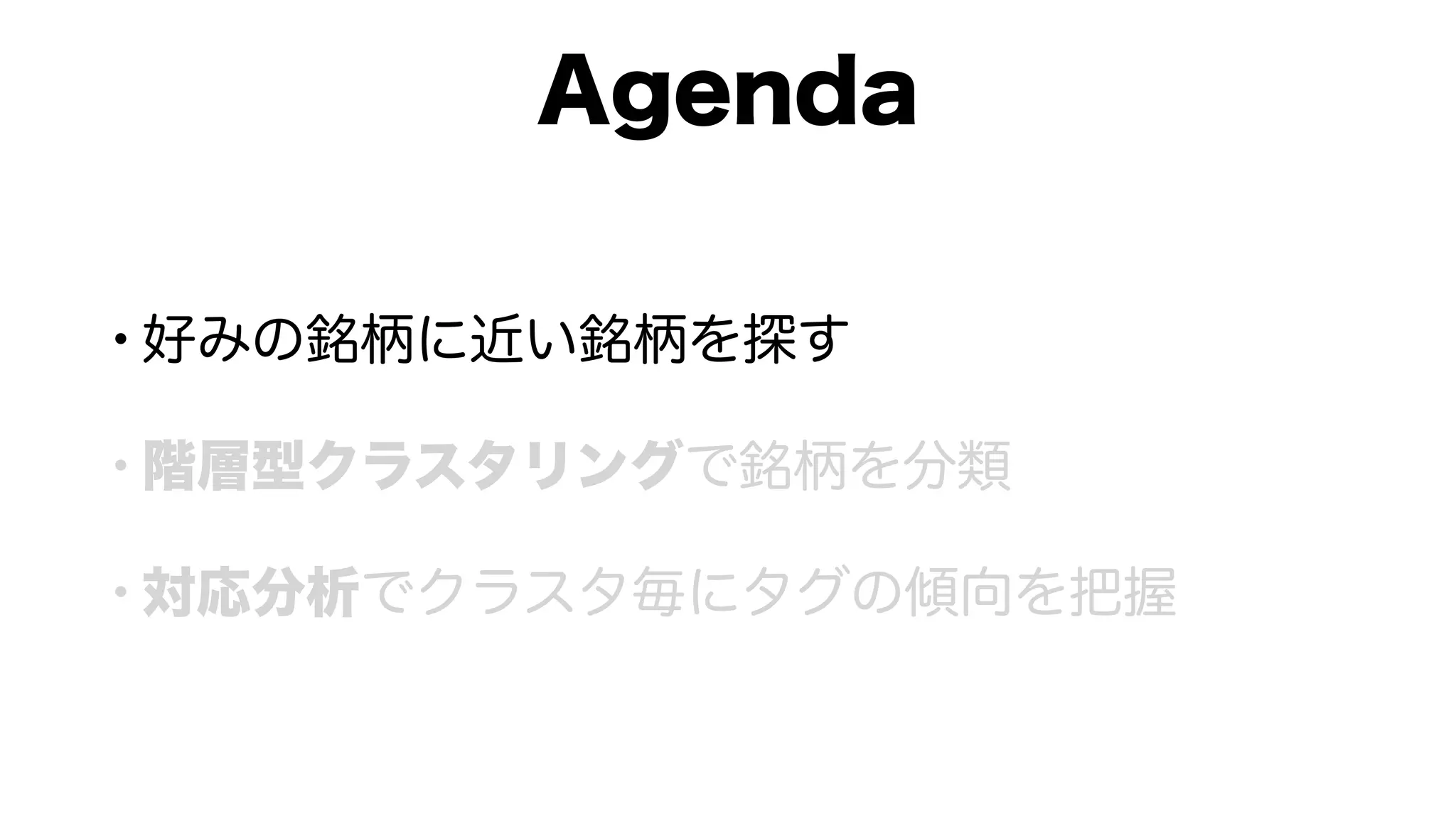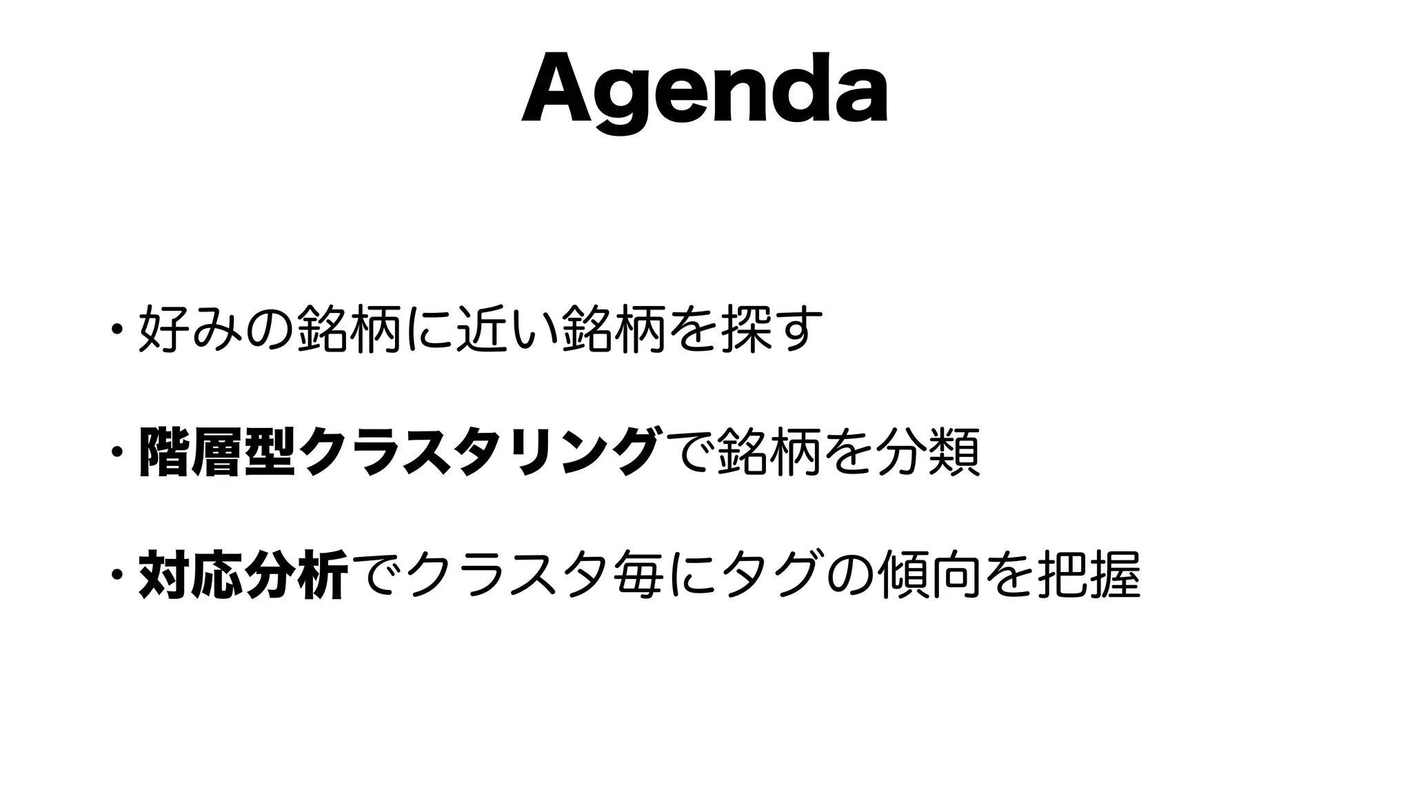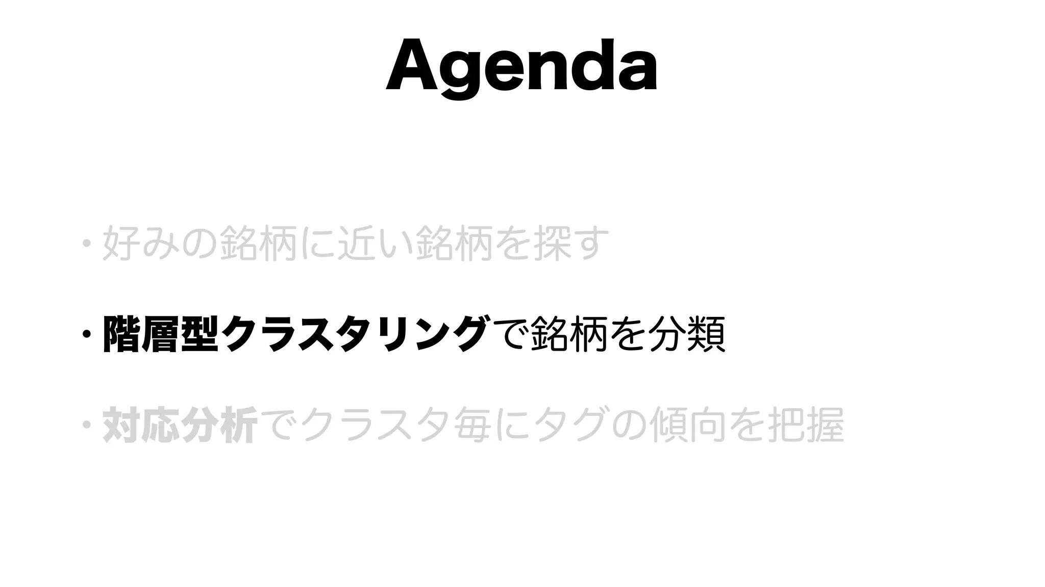 This document analyzes Japanese sake brand data to cluster brands and identify similarities. It first calculates cosine distances between brands based on flavor profiles. It then performs hierarchical clustering on the distances to group brands into 6 clusters. Finally, it creates radar charts of average flavor profiles and word clouds of common tags for each cluster to visualize differences between the groups.