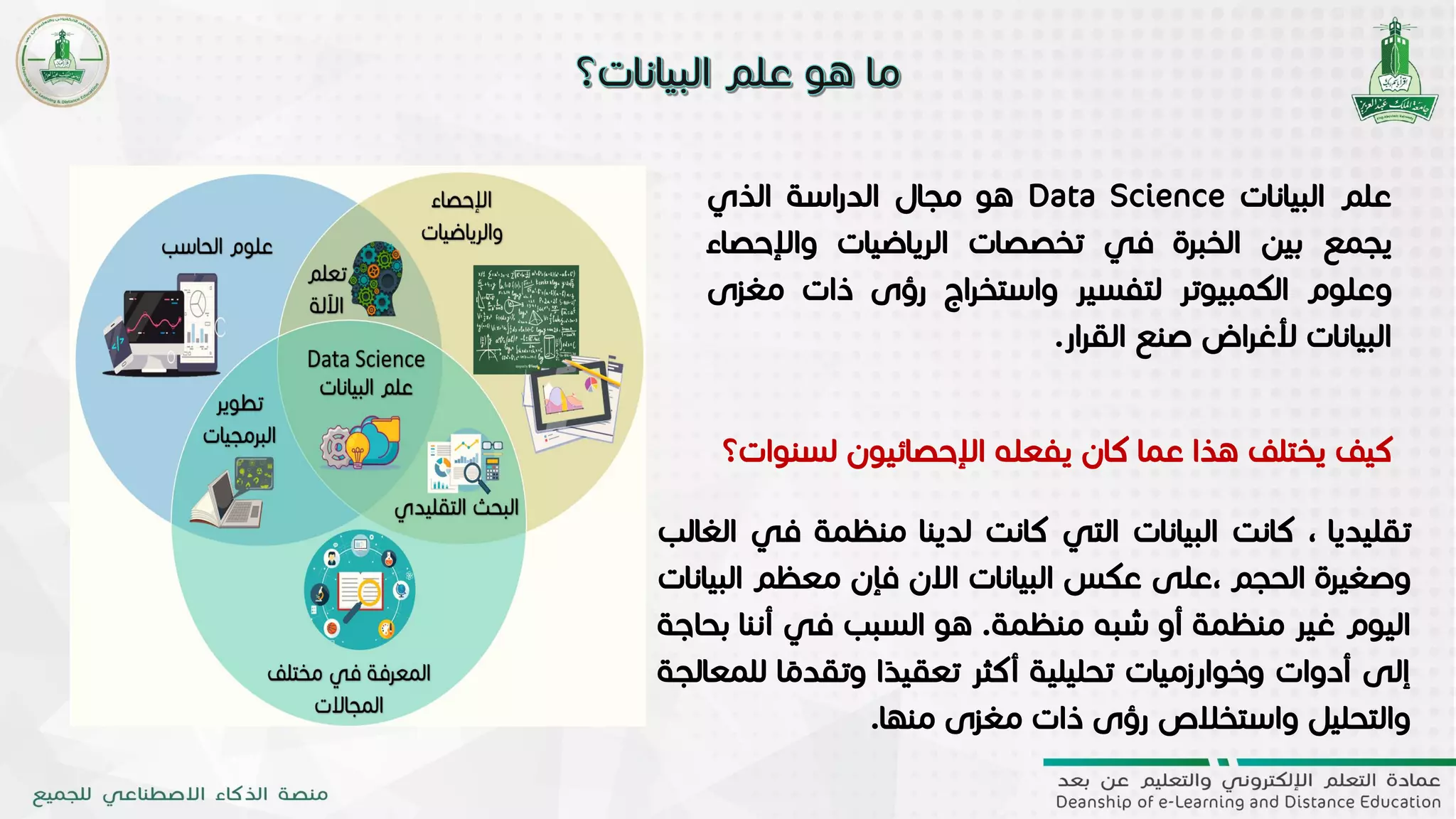 علم البيانات هو مجال يدمج الرياضيات والإحصاء وعلوم الكمبيوتر لفهم البيانات واستخراج رؤى قيمة منها. تطورت الحاجة لأدوات تحليلية أكثر تعقيدًا مع زيادة حجم البيانات وظهور البيانات غير المنظمة. يشمل عمل ممارسي علم البيانات تكنولوجيا إدخال البيانات وتنظيفها، وتحليل البيانات، مما يؤدي إلى اتخاذ قرارات مستندة إلى رؤى مستخلصة.