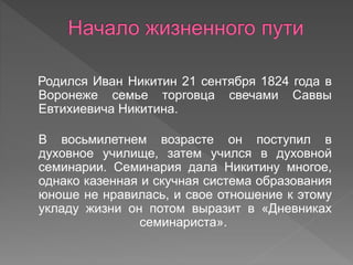 Иван Никитин, родившийся в 1824 году в Воронеже, был русским поэтом, известным своими стихами о природе и тяжелой жизни крестьян. Он начал писать стихи в юном возрасте, дебютировав в печати в 1851 году, и опубликовал два сборника стихотворений до своей смерти от чахотки в 1861 году. Его наиболее значительное произведение – поэма 'Кулак', в которой отражены автобиографические элементы и социальные темы.