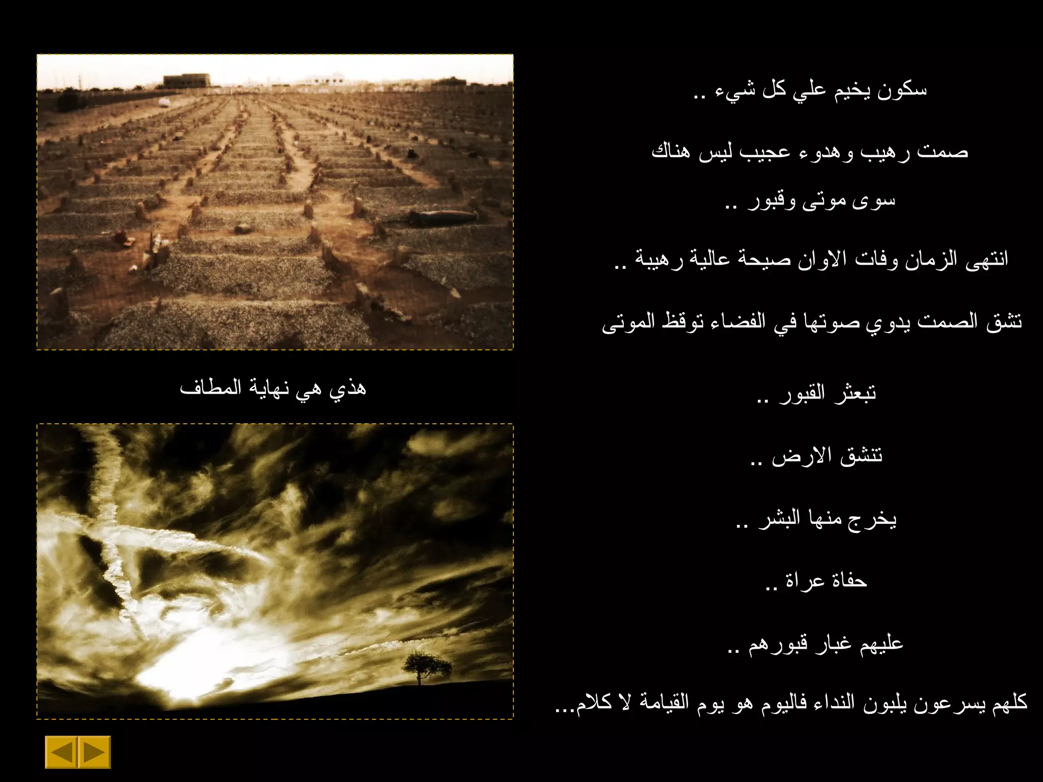 تتناول الوثيقة مشهد القيامة ووقوف البشر أمام الله، حيث يتعامل الكل مع لحظة الحساب والمصير. وتسلط الضوء على أهمية الأعمال الصالحة والإيمان، وتشجع على الدعاء للموتى وطلب المغفرة. الرسالة الرئيسية هي تذكير الناس بضرورة التحلي بالتقوى والعمل الصالح في حياتهم.