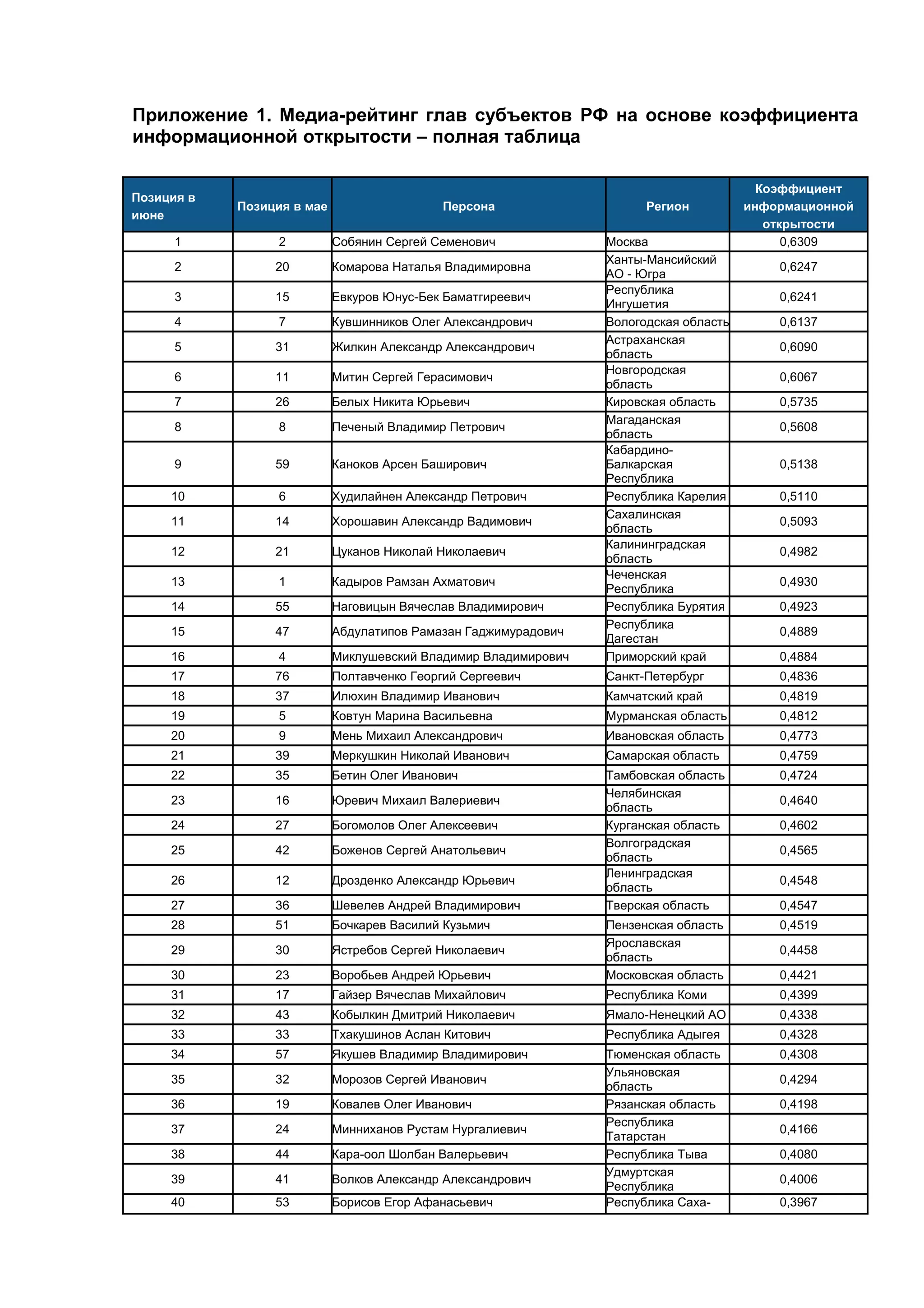 Документ представляет собой таблицу медиарейтинга глав субъектов Российской Федерации на основе коэффициента информационной открытости. В ней содержатся данные о позициях и коэффициентах 83 руководителей регионов за июнь и май, что позволяет увидеть динамику изменений. На первом месте находится Юнус-Бек Евкуров из Республики Ингушетия (0,6241).