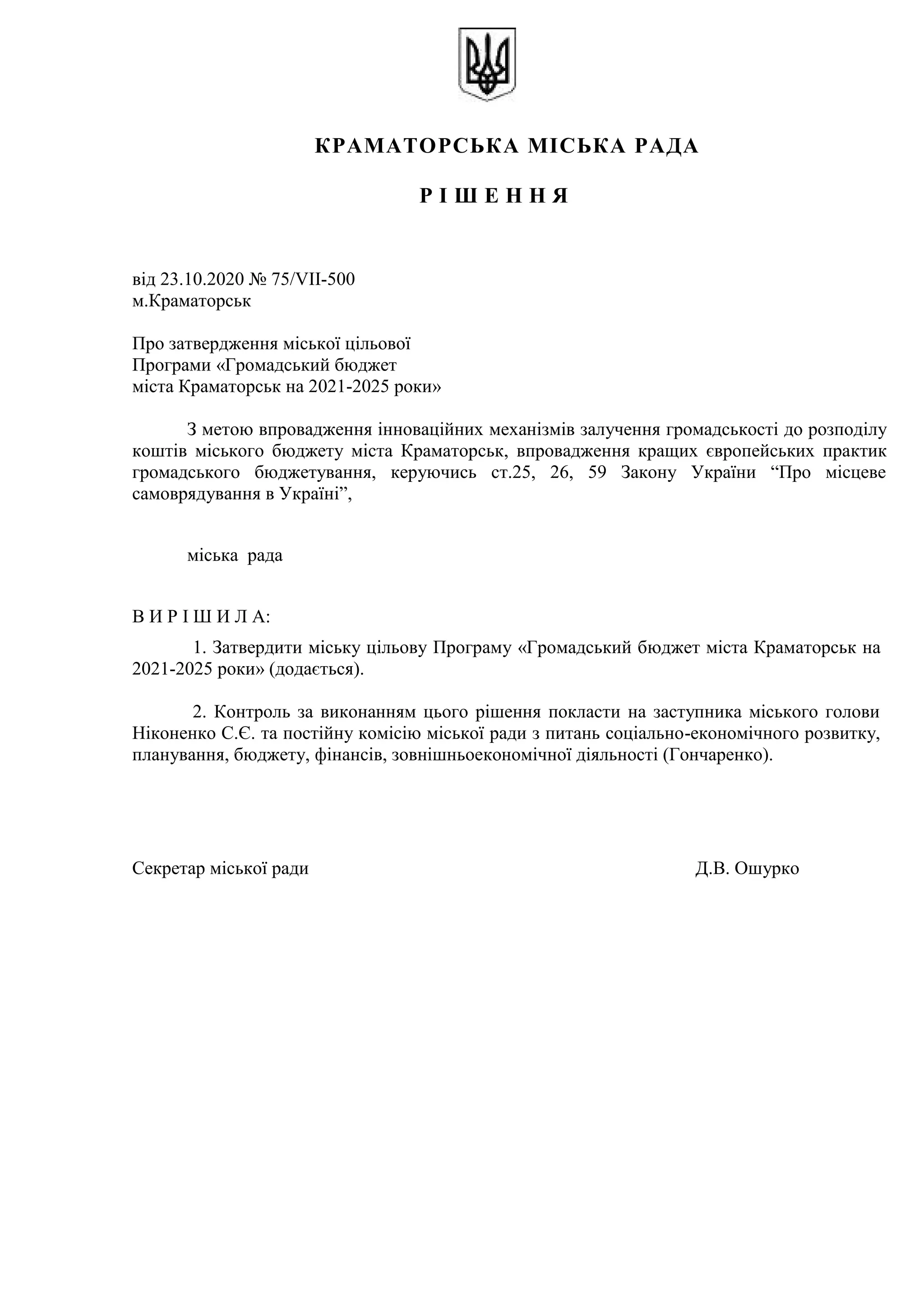 1. Затвердити міську цільову Програму «Громадський бюджет міста Краматорськ на