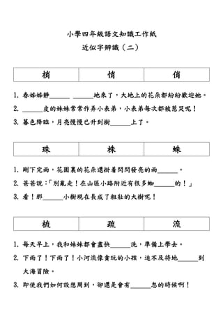 这是一个关于小学四年级语文知识的工作纸,主要内容是近似字的辨识练习。文档包括了填空题和答案,帮助学生理解和学习这些字词的使用。通过不同的句子示例,学生能够更好地掌握近似字的含义和用法。