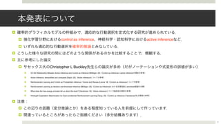 This document discusses the relationship between control as inference, reinforcement learning, and active inference. It provides an overview of key concepts such as Markov decision processes (MDPs), partially observable MDPs (POMDPs), optimality variables, the evidence lower bound (ELBO), variational inference, and the free energy principle as applied to active inference. Control as inference frames reinforcement learning as probabilistic inference by defining a generative process and performing variational inference to find an optimal policy. Active inference uses the free energy principle and minimizes expected free energy to select actions that resolve uncertainty.