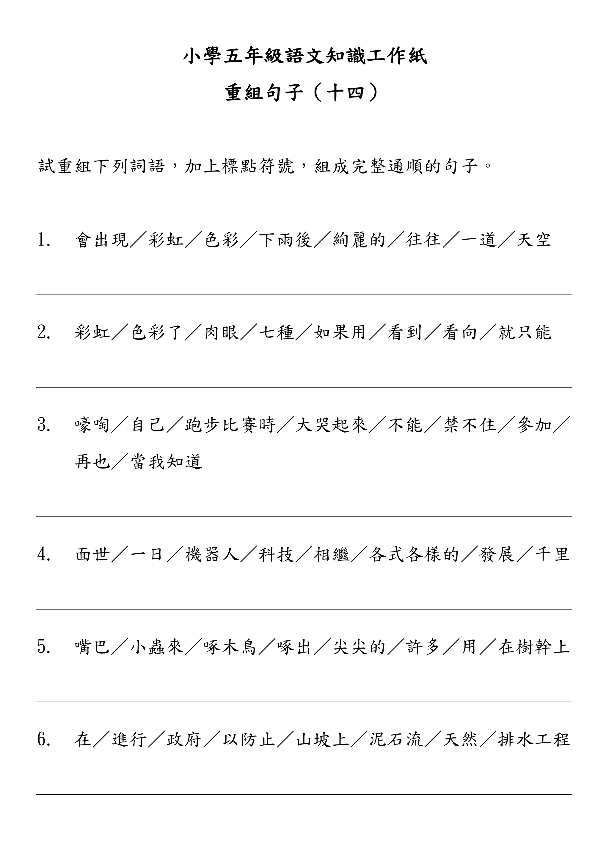 嚎啕/自己/跑步比賽時/大哭起來/不能/禁不住/參加/ 再也/當我知道 4. 面世/一日/機器人/科技/相繼/各式各樣的/發展/千里 5. 嘴巴/小蟲來/啄木鳥/啄出/尖尖的/許多/用/在樹幹上 6. 在/進行/政府/以防止/山坡上/泥石流/天然/排水工程