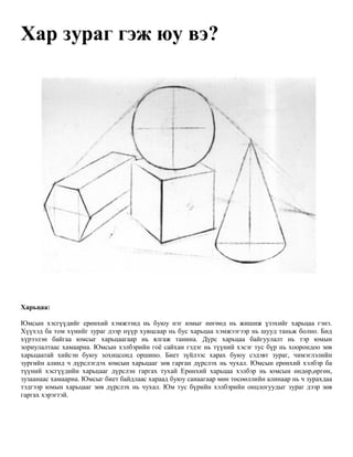 ба зургийн хуудсан дээрээ дүрс зураг байрлуулах тохиромжтой байдлыг тодорхойлохын тулд нүдний өмнө ажиглах цонхоо босоо тэгш байдлаар бариарай. Түүнийгээ баруун зүүн, дээш доош болгон нүхээр нь харж зурагт дүрслэх юмын тохиромжтой байдлыг хайх хэрэгтэй. Гэрэл сүүдэр: Аливаа биетийн хэлбэр дүрсийг зөвхөн харьцаа төдийгүй эзэлхүүнт байдал, гэрэл сүүдрийн хамтаар ялган зурж болно. Гэрэл сүүдэр нь юмыг ямраар харагдаж байгаа үнэн бодит байдлаар нь дүрслэхэд чухал хэрэглүүр мөн. Гэрэлтүүлгийн нэг ба хэд хэдэн цэг, өөрийн ба унасан сүүдэр Янз бүрийн чиглэлээр янз бүрийн юмс дээр хол, ойр зайнаас гэрлийн туяа тусна. Гэрлийн туяа юман дээр янз бүрийн хэмжээгээр хуваагдан тусна. Цонхны гэрэлд ойр байгаа нь сайн, хол байгаа юмс муу гэрэлтүүлэгдэнэ. Гэрэлтүүлгийн цэг хэд хэд байж болно. Юмсын бие дээрх сүүдрийг өөрийнх, түүнээс суурь дээрээ туссан сүүдрийг унасан сүүдэр гэж тус тус нэрлэнэ. Юмсын дүрс хэлбэр ба гэрлийн туяаны чиглэлээс гэрэл сүүдрийн хамаарах нь: Хэрэв юман дээр гэрэлтүүлгийн ганц цэгээс туяа тусгавал тэр нь юмны сүүдэртсэн хэсгийн болон унасан сүүдрийн нарийн зааг, тэдгээрийн тодорхой хэлбэрийг харуулна. Сүүдэр нь гэрлийн цэгийн эсрэг талд байдгийг мэднэ. Гэрэл ба сүүдрийн хооронд хагас сүүдэр байна. Гэрэлтүүлгийн цэг нь хажуугаас буюу шууд байвал хажуугийн буюу шууд гэрэлтүүлэг гэж нэрлэдэг. Гэрэлтүүлгийн цэг нь юмны цаана байх тохиолдолд зураачдад бүрэн сүүдэртэй тал нь харагдаж байна. Гэрэлтүүлсэн тал нь сүүдэртэй талдаа халхлагдаж байна.
