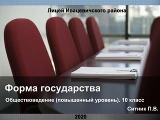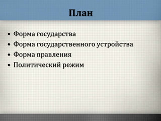 Документ охватывает тему форм государства и правления, включая философские идеи Платона и Аристотеля, а также типы политических режимов. Рассматриваются различные модели идеального государства, формы правления (монархия, республика) и их классификации, а также политические режимы (демократический, авторитарный, тоталитарный). В заключение подчеркивается, что политика должна стремиться к справедливому общему благу и стабильности в обществе.