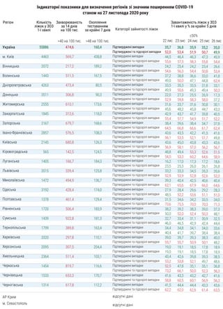 ЗОЗ 1-ї хвилі у % за крайні 5 днів ≤50% 35,0 49,9 45,9 54,4 26,6 53,4 41,8 62,4 33,1 50,3 17,3 37,2 30,1 43,3 40,5 52,2 37,8 62,4 41,6 49,8 43,6 56,7 51,5 58,9 18,6 26,8 35,6 52,3 40,4 64,6 28,3 51,0 34,0 71,3 37,3 48,1 32,5 44,4 33,6 38,4 40,0 48,2 18,9 18,9 38,5 48,6 36,8 56,3 41,6 56,3 43,6 63,5 26 лис 35,2 50,7 47,3 55,8 23,4 50,8 33,0 44,8 31,8 49,4 26,9 58,0 30,8 44,7 39,8 51,7 34,7 61,7 41,5 51,7 43,3 56,2 52,6 64,6 17,2 26,1 35,3 52,6 40,6 66,0 29,2 51,1 33,5 70,3 39,0 50,3 30,9 42,4 34,0 38,4 38,3 50,1 17,8 17,8 39,3 49,7 35,1 52,3 42,7 56,9 43,3 61,4 25 лис 35,9 51,9 46,3 58,3 24,2 54,4 36,6 47,1 33,5 49,3 25,5 58,3 31,6 45,8 41,7 54,9 38,4 66,6 42,2 52,1 43,8 57,0 53,3 60,2 17,3 26,0 34,5 52,8 42,5 67,9 29,6 53,6 34,2 70,0 38,3 52,4 31,1 42,9 34,1 39,7 39,3 50,9 18,5 18,5 39,8 52,1 35,1 50,0 43,2 60,1 44,4 62,6 24 лис 36,8 53,4 46,4 57,5 25,4 56,3 38,8 50,0 35,3 50,6 27,3 59,8 33,7 48,2 43,7 57,7 39,6 66,8 43,5 53,5 45,0 58,1 49,4 53,3 17,0 25,3 33,3 53,9 40,4 65,6 28,4 52,2 34,6 75,5 39,2 52,0 33,4 46,5 34,8 41,7 39,7 55,7 19,1 19,1 42,6 53,8 47,8 66,1 43,3 60,5 44,4 62,0 23 лис 35,7 52,0 44,5 55,6 24,2 54,6 37,2 49,0 33,5 49,9 22,0 52,9 31,6 45,6 42,9 55,4 38,4 64,5 43,6 56,1 43,6 56,9 48,8 54,5 16,2 23,5 33,2 52,9 39,3 62,1 27,9 48,5 31,5 73,6 38,2 50,0 32,7 46,0 34,4 40,4 39,0 55,7 19,0 19,0 43,4 53,2 52,5 73,2 41,6 58,8 41,5 62,2 22 лис Регіон Кількість ліжок у ЗОЗ 1-ї хвилі <40 на 100 тис. >48 на 100 тис. м. Київ Вінницька Волинська Дніпропетровська Донецька Житомирська Закарпатська Запорізька Івано-Франківська Київська Кіровоградська Луганська Львівська Миколаївська Одеська Полтавська Рівненська Сумська Тернопільська Харківська Херсонська Хмельницька Черкаська Чернівецька Чернігівська АР Крим м. Севастополь відсутні дані відсутні дані 55886 4463 2072 1443 4263 3511 2555 1845 2167 2857 2145 565 1405 3515 1472 3192 1378 1720 1439 1799 3320 2095 2364 1454 1533 1314 Захворюваність за 14 днів на 100 тис. Охоплення тестуванням за крайні 7 днів 474,6 569,7 217,2 511,5 473,4 306,8 610,1 312,6 679,7 576,5 680,8 142,5 166,7 339,4 494,9 428,4 461,4 506,4 922,8 389,8 297,8 307,5 511,4 819,7 653,3 617,8 160,4 438,8 189,2 167,5 80,5 90,3 173,6 118,0 168,6 108,3 126,3 124,5 184,3 125,8 136,7 174,0 129,4 183,9 181,3 163,4 110,1 204,4 103,1 116,6 170,7 112,2 Категорії зайнятості ліжок Підтверджені випадки Підтверджені та підозрілі випадки Україна Підтверджені випадки Підтверджені та підозрілі випадки Підтверджені випадки Підтверджені та підозрілі випадки Підтверджені випадки Підтверджені та підозрілі випадки Підтверджені випадки Підтверджені та підозрілі випадки Підтверджені випадки Підтверджені та підозрілі випадки Підтверджені випадки Підтверджені та підозрілі випадки Підтверджені випадки Підтверджені та підозрілі випадки Підтверджені випадки Підтверджені та підозрілі випадки Підтверджені випадки Підтверджені та підозрілі випадки Підтверджені випадки Підтверджені та підозрілі випадки Підтверджені випадки Підтверджені та підозрілі випадки Підтверджені випадки Підтверджені та підозрілі випадки Підтверджені випадки Підтверджені та підозрілі випадки Підтверджені випадки Підтверджені та підозрілі випадки Підтверджені випадки Підтверджені та підозрілі випадки Підтверджені випадки Підтверджені та підозрілі випадки Підтверджені випадки Підтверджені та підозрілі випадки Підтверджені випадки Підтверджені та підозрілі випадки Підтверджені випадки Підтверджені та підозрілі випадки Підтверджені випадки Підтверджені та підозрілі випадки Підтверджені випадки Підтверджені та підозрілі випадки Підтверджені випадки Підтверджені та підозрілі випадки Підтверджені випадки Підтверджені та підозрілі випадки Підтверджені випадки Підтверджені та підозрілі випадки Підтверджені випадки Підтверджені та підозрілі випадки Індикаторні показники для визначення регіонів зі значним поширенням COVID-19 станом на 27 листопада 2020 року