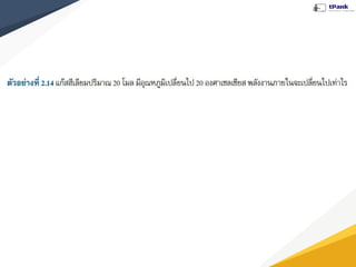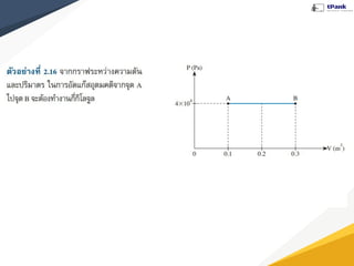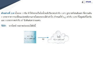 : U) คือ พลังงานจลน์ + พลังงานศักย์ (ขึ้นอยู่กับอุณหภูมิ) แก๊สอุดมคติ --> พลังงานภายในระบบ = พลังงานจลน์ อุณหภูมิ เพิ่มขึ้น ลดลง พลังงานภายในระบบเพิ่มขึ้น พลังงานภายในระบบลดลง