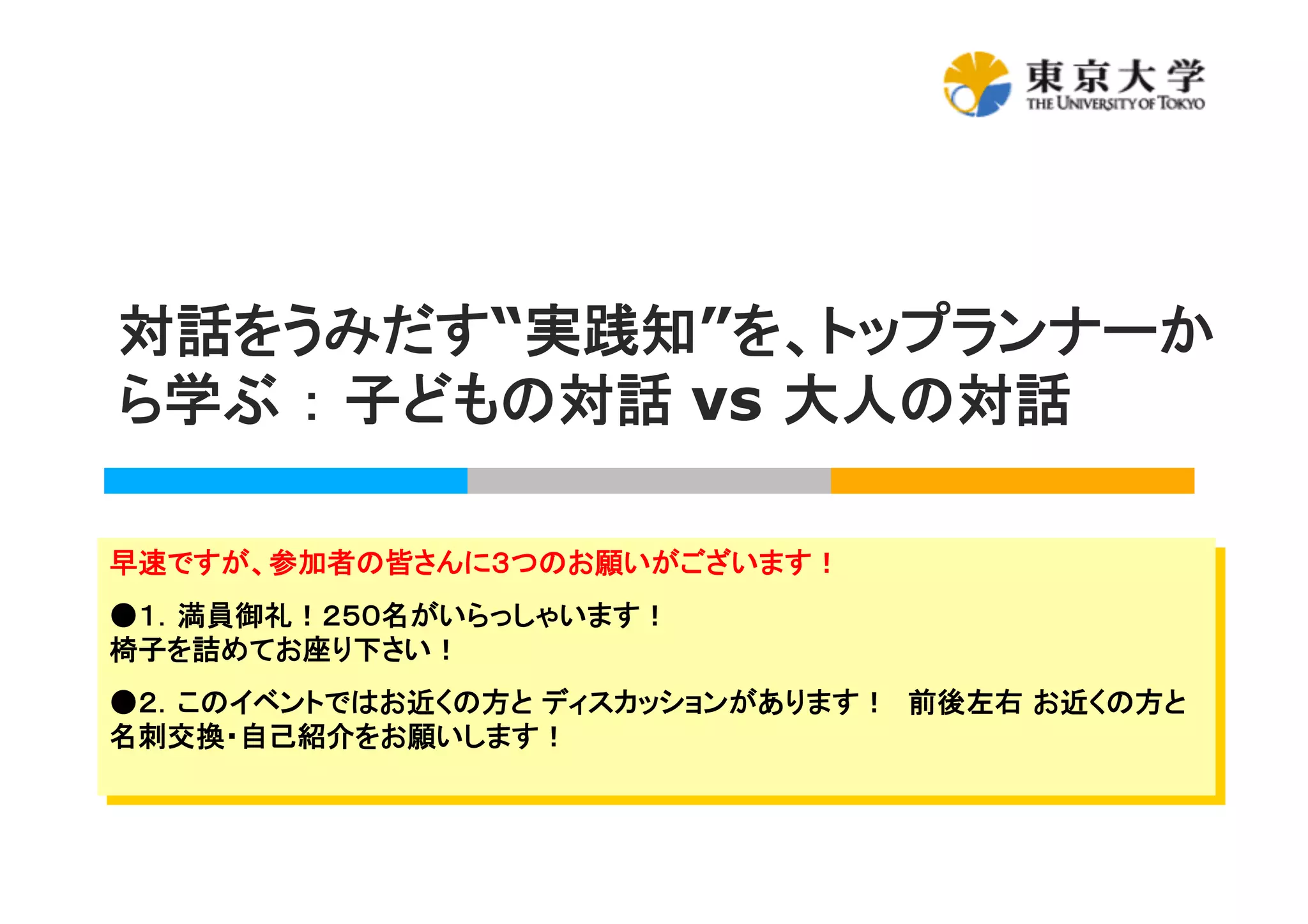 早速ですが、参加者の皆さんに3つのお願いがございます! ●1.満員御礼!250名がいらっしゃいます! 椅子を詰めてお座り下さい! ●2.このイベントではお近くの方と ディスカッションがあります! 前後左右 お近くの方と 名刺交換・自己紹介をお願いします! 対話をうみだす“実践知”を、トップランナーか ら学ぶ