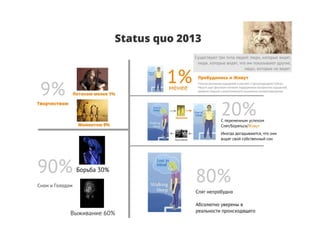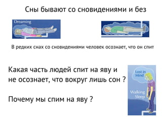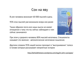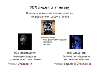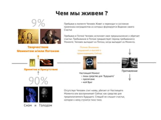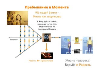 Время является иллюзией, созданной ошибками ума, и настоящее существует только в моменте 'здесь и сейчас'. Настоящий момент — это контекст событий и действий, а внимание человека часто отвлекается на беспокойство и сожаление, что приводит к 'сну наяву'. В таком состоянии жизнь протекает мимо человека, и он не участвует в ней активно.