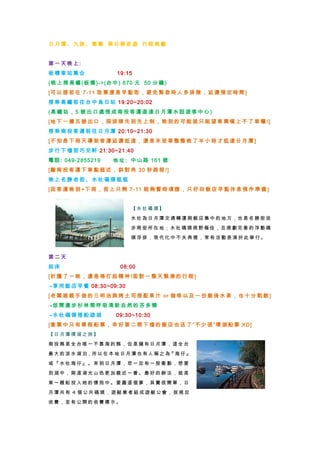 这是一个为期两天的日月潭及九族游行程规划,包括交通、住宿、美食与景点安排。行程涵盖了水社码头、日月潭游湖以及九族文化村等主要景点,并建议游客体验当地特色与自然风光。文档详细说明了每个活动的时间安排和注意事项,以确保游客能够舒适且愉快地享受旅程。