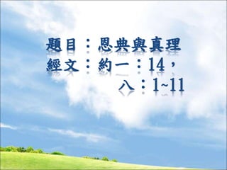 文档探讨了神的爱、恩典与真理的关系,强调恩典是神无条件的爱,而真理则是可以定义和遵循的现实。通过耶稣的救恩,人们获得了罪的赦免和圣灵的引导。最后,讲述了先有恩典后有真理的概念,以及真理带来的自由。