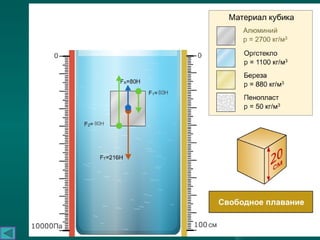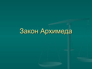 Документ описывает законы Архимеда и Паскаля, касающиеся физики плавания и давления в жидкости. Архимед изложил принципы, согласно которым выталкивающая сила на погруженное тело равна весу вытесненной жидкости, а условия плавания определяются разницей плотностей. Рассматриваются примеры задач, связанных с применением этих законов в различных ситуациях.