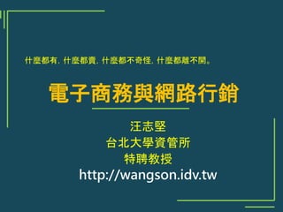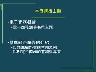 本演講由國立台北大學的汪志堅教授主講,探討電子商務及網路行銷的重要性和發展趨勢,特別是精準網路廣告的應用。電子商務的範疇廣泛,包括企業經營、消費行為及網路技術發展,而精準廣告則透過消費者資料分析,提升廣告的有效性。演講中還分析了如何利用人口統計資料、瀏覽行為及地理位置來精準鎖定目標客戶。