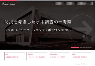 防災を考慮した水中調査の一考察 ~災害コミュニケーションシンポジウム2020~ 2020年12月25日 さくらインターネット株式会社 さくらインターネット研究所