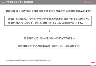 昨今課題となっている災害対策 農林水産省 / 平成30年7月豪雨等を踏まえた今後のため池対策の進め方より* ・決壊した32か所...うち29か所が防災重点ため池に選定されていなかった。 ・農業利用されておらず、適正に管理されていないため池が存在する。 ↓ 自治体による「ため池ハザードマップ作成」へ 本件課題に対する改善策等の一助として、研究紹介する。 2 *http://www.bousai.go.jp/fusuigai/suigai_dosyaworking/pdf/dai2kai/siryo1-3.pdf