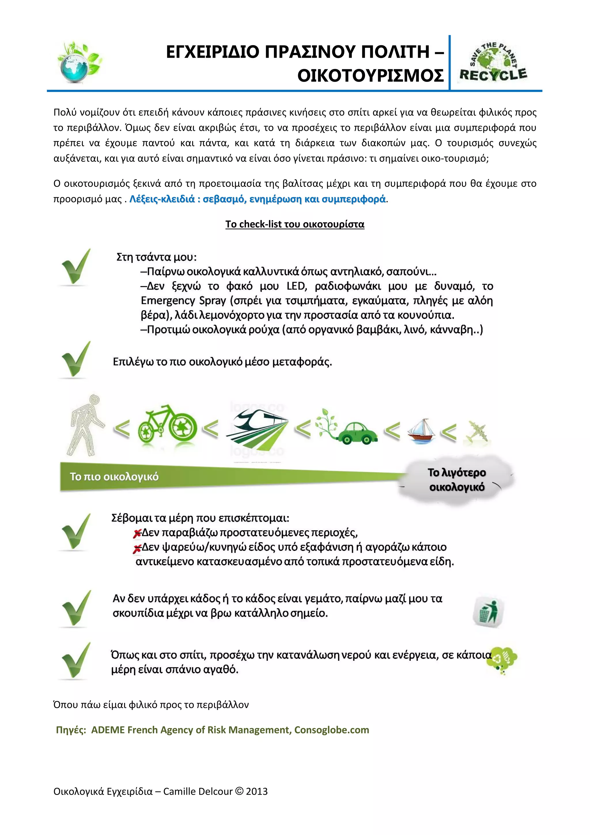 – ΟΙΚΟΤΟΥΡΙΣΜΟΣ Οικολογικά Εγχειρίδια – Camille Delcour © 2013 Πολύ νομίζουν ότι επειδή κάνουν κάποιες πράσινες κινήσεις στο σπίτι αρκεί για να θεωρείται φιλικός προς το περιβάλλον. Όμως δεν είναι ακριβώς έτσι, το να προσέχεις το περιβάλλον είναι μια συμπεριφορά που πρέπει να έχουμε παντού και πάντα, και κατά τη διάρκεια των διακοπών μας. Ο τουρισμός συνεχώς αυξάνεται, και για αυτό είναι σημαντικό να είναι όσο γίνεται πράσινο: τι σημαίνει οικο-τουρισμό; Ο οικοτουρισμός ξεκινά από τη προετοιμασία της βαλίτσας μέχρι και τη συμπεριφορά που θα έχουμε στo προορισμό μας . ΛΛέέξξεειιςς--κκλλεειιδδιιάά :: σσεεββαασσμμόό,, εεννηημμέέρρωωσσηη κκααιι σσυυμμππεερριιφφοορράά. Το check-list του οικοτουρίστα Όπου πάω είμαι φιλικό προς το περιβάλλον Πηγές: ADEME French Agency of Risk Management, Consoglobe.com