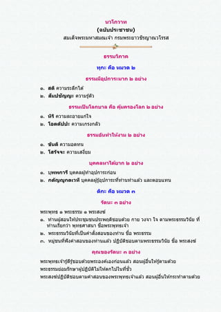 ความขยันช่วยเอาใจใส่ในกิจธุระของเพื่อนภิกษุสามเณร ๖. ธัมกามตา ความใคร่ในธรรมที่ชอบ ๗. วิริยะ เพียรเพื่อจะละความชั่ว ประพฤติความดี ๘. สันโดษ ยินดีด ้วยผ ้านุ่งผ ้าห่ม อาหาร ที่นอนที่นั่งและยา ตามมีตามได ้ ๙. สติ จาการที่ได ้ทาและคาที่พูดแล ้วแม ้นานได ้ ๑๐. ปัญญา รอบรู ้ในกองสังขารตามเป็นจริงอย่างไร กถาวัตถุคือถ้อยคาที่ควรพูด ๑๐ อย่าง ๑. อัปปิจฉกถา ถ ้อยคาที่ชัดนาให ้มีความปรารถนาน้อย ๒. สันตุฏฐิกถา ถ ้อยคาที่ชักนาให ้มีสันโดษ ยินดีด ้วยปัจจัยตามมีตามได ้ ๓. ปวิเวกกถา ถ ้อยคาที่ชักนาให ้สงัดกายสงัดใจ ๔. อสังสัคคกถา ถ ้อยคาที่ชักนาไม่ให ้ระคนด ้วยหมู่ ๕. วิริยารัมภกถา ถ ้อยคาที่ชักนาให ้ปรารภความเพียร ๖. สีลกถา ถ ้อยคาที่ชัดนาให ้ตั้งอยู่ในศีล ๗. สมาธิกถา ถ ้อยคาที่ชักนาให ้ทาใจให ้สงบ ๘. ปัญญากถา ถ ้อยคาที่ชักนาให ้เกิดปัญญา ๙. วิมุตติกถา ถ ้อยคาที่ชักนาให ้ทาใจให ้พ ้นจากกิเลส ๑๐. วิมุตติญาณทัสสนกถา ถ ้อยคาที่ชักนาให ้เกิดความรู ้ความเห็นในความที่ใจ พ ้นจากกิเลส อนุสสติ คือ อารมณ์ควรระลึก ๑๐ ประการ ๑. พุทธานุสสติ ระลึกถึงคุณของพระพุทธเจ ้า ๒. ธัมมานุสสติ ระลึกถึงคุณของพระธรรม ๓. สังฆานุสสติ ระลึกถึงคุณของพระสงฆ์ ๔. สีลานุสสติ ระลึกถึงศีลของตน ๕. จาคานุสสติ ระลึกถึงทานที่ตนบริจาคแล ้ว ๖. เทวตานุสสติ ระลึกถึงคุณที่ทาบุคคลให ้เป็นเทวดา ๗. มรณัสสติ ระลึกถึงความตายที่จะมาถึงตน ๘. กายคตาสติ ระลึกทั่วไปในกาย ให ้เห็นว่า ไม่งาม น่าเกลียด โสโครก ๙. อานาปานสติ ตั้งสติกาหนดลมหายใจเข ้าออก ๑๐. อุปสมานุสสติ ระลึกถึงพระคุณพระนิพพาน ซึ่งเป็นที่ระงับกิเลสและกองทุกข์ ปกิณณกะ คือ หมวดเบ็ดเตล็ด อุปกิเลส คือ โทษเครื่องเศร้าหมอง ๑๖ อย่าง ๑. อภิชฌาวิสมโลภะ ละโมบไม่สม่าเสมอ ๒. โทสะ ร ้ายกาจ ๓. โกธะ โกรธ