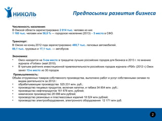 Документ содержит информацию о компании 'Николь', основанной в 1995 году, которая является крупным дистрибьютором автокомпонентов в Омске и обладающей разветвленной сетью продаж. Основные направления бизнеса компании включают оптовую и розничную продажу автозапчастей, а также инновационные технологии для увеличения добычи нефти. 'Николь' обеспечивает логистику и качественное обслуживание клиентов, активно продвигая свою продукцию через различные маркетинговые стратегии.