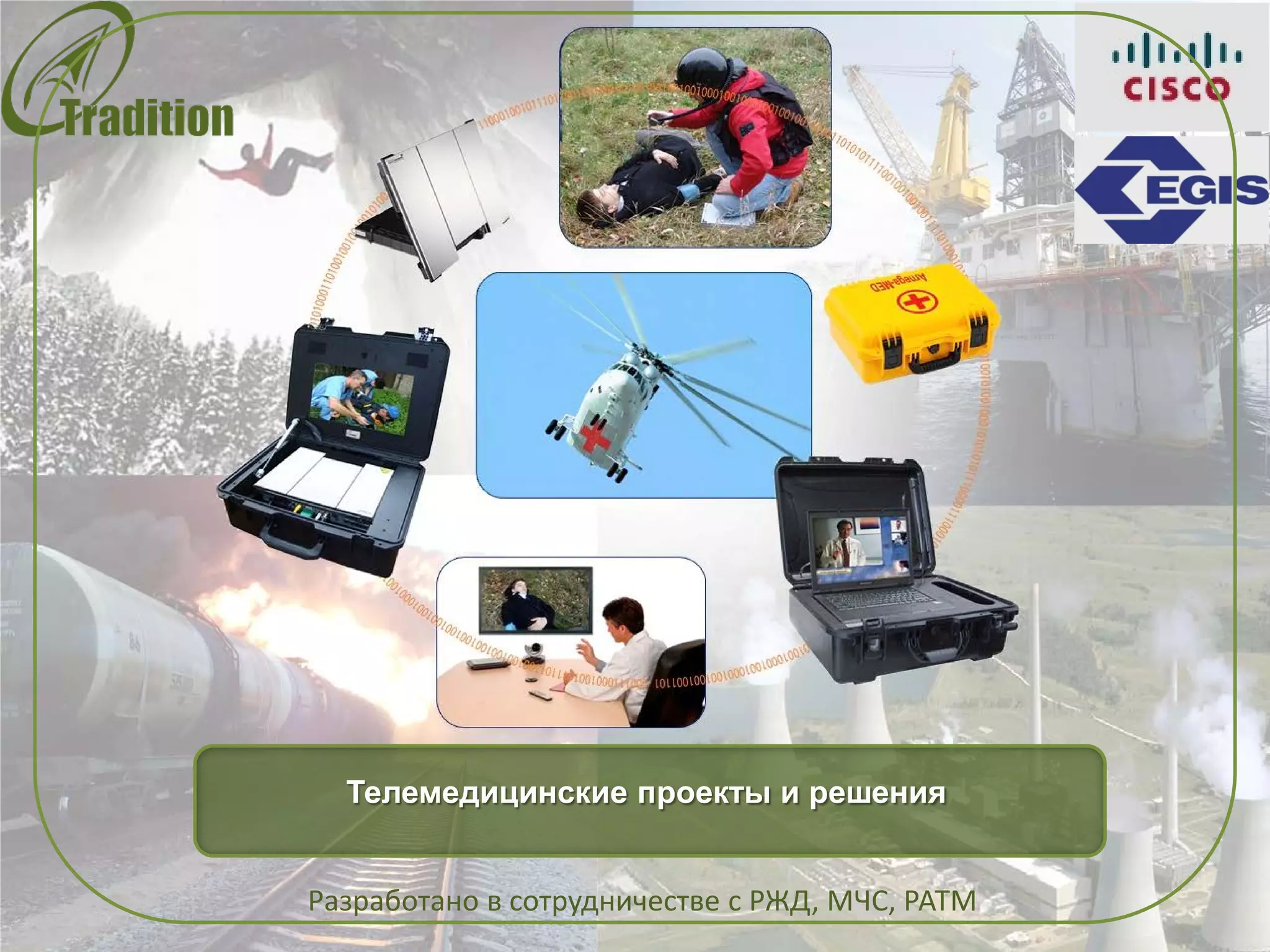 Документ описывает телемедицинские проекты, разработанные в сотрудничестве с РЖД и МЧС, направленные на обеспечение медицинских служб высокотехнологичными решениями для передачи данных, мониторинга состояния пациентов и дистанционной поддержки на местах. В нем подробно рассматриваются различные медицинские устройства и системы для контроля здоровья, включая портативные датчики и телемедицинские комплексы, а также решения для экстренных служб и удаленной медицинской помощи. Основное внимание уделяется интеграции новых технологий для повышения доступности и качества медицинских услуг.