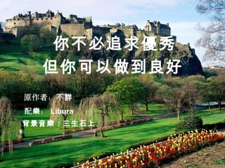 本文件讲述了一位同事过着简单而规律的生活,强调追求'良好'而非'优秀'的重要性。她在父亲的教导下找到适合自己的生活节奏,并享受当下的生活而不被外界评判干扰。文章指出,生活的简单和自由是关键,过度追求完美只会导致痛苦和挫折。