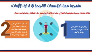 تتناول الوثيقة إدارة الأزمات في المؤسسات، حيث تسلط الضوء على أهمية منهجية تحليل الأزمات وتقديم حلول فعالة لها. يشمل ذلك فحص أسباب الأزمات، التواصل الفعّال، وضرورة التخطيط الاستباقي لمنع الأزمات. كما تقدم استراتيجيات وإجراءات لتحسين التعامل مع الأزمات وتحليلها.