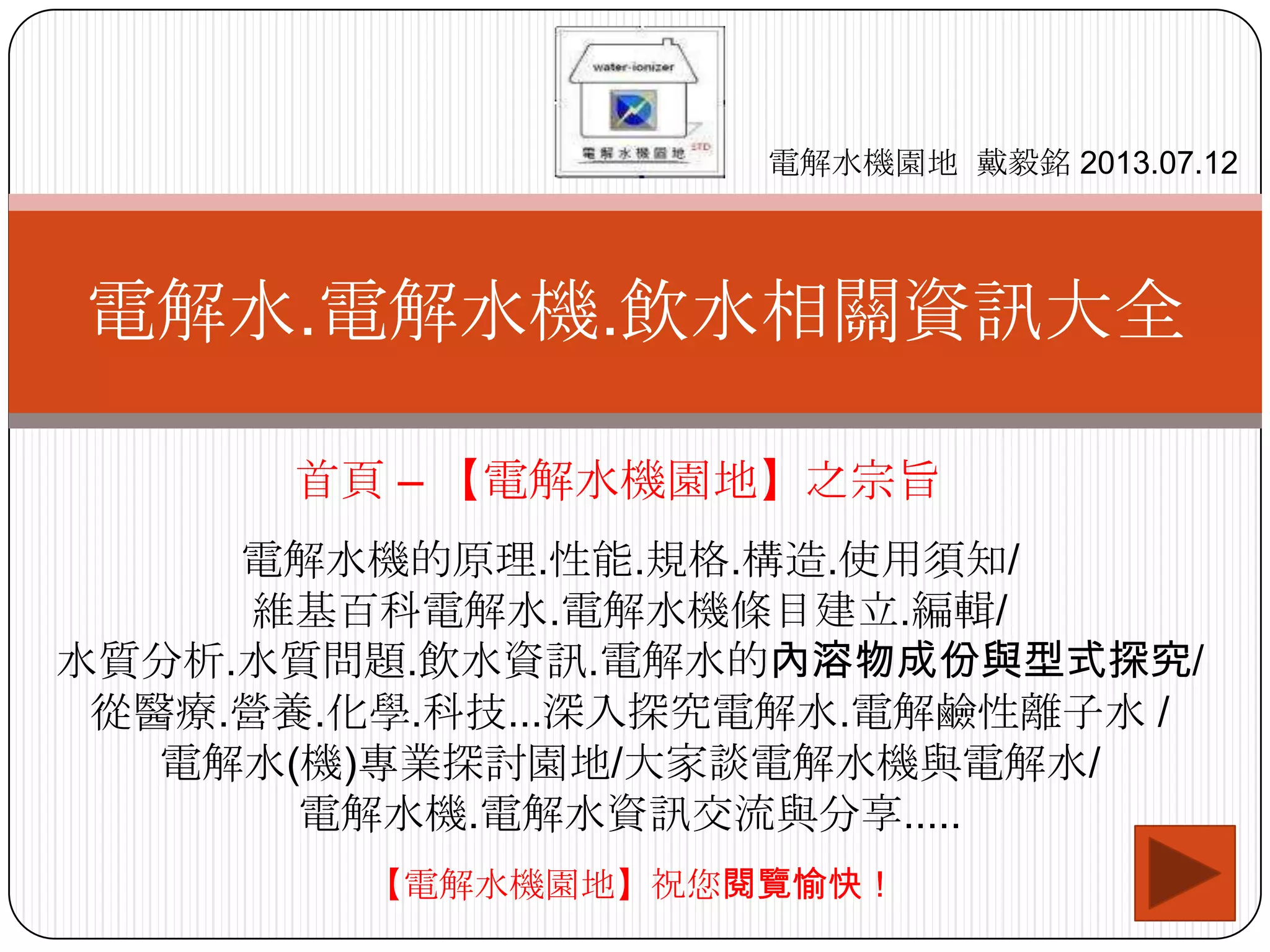 本文档讨论了电解水机的原理、性能和使用注意事项,提供了关于饮水的各种信息,涉及医疗、营养、化学和科技等领域。内容涵盖了电解水中的成分分析和水质问题的处理方法。文档还分享了在电解水机推广中遇到的挑战和网络评论的分析。