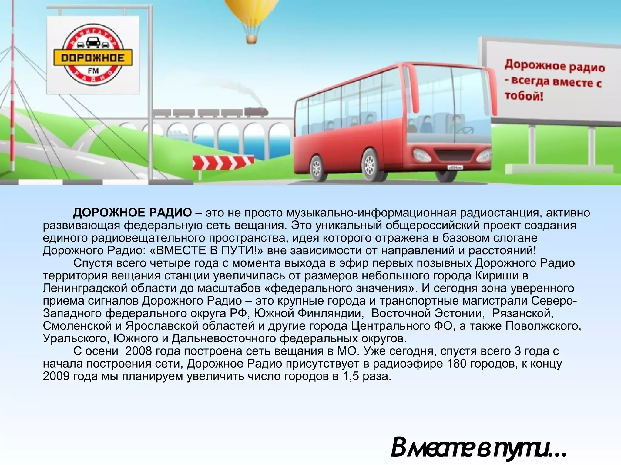 Дорожное радио – это общероссийская радиостанция, созданная для формирования единого радиовещательного пространства, которая за четыре года расширила свою сеть вещания до федерального масштаба, охватывающей более 250 городов России. По состоянию на 2009 год, ежедневно радио достигало более 5,5 миллионов слушателей и активно развивает своё присутствие в различных федеральных округах. Аудитория дорожного радио демонстрирует высокий рейтинг по сравнению с другими радиостанциями, что подтверждается статистическими данными.