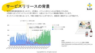 rights reserved. 昨年の緊急事態宣言をきっかけに、2月頃は、イベントのキャンセルが相次いだものの、 3月頃からオンラインイベントに切り替わり、以前よりもイベント実施数が増加しています。 オンラインに切り替えることで、手軽に実施することができたり、頻度高く実施することが可能です。 サービスリリースの背景 参照) Peatix 2020年オンラインイベントに関する調査 https://blog.peatix.com/featured/2020_onine_event_su rvey.html