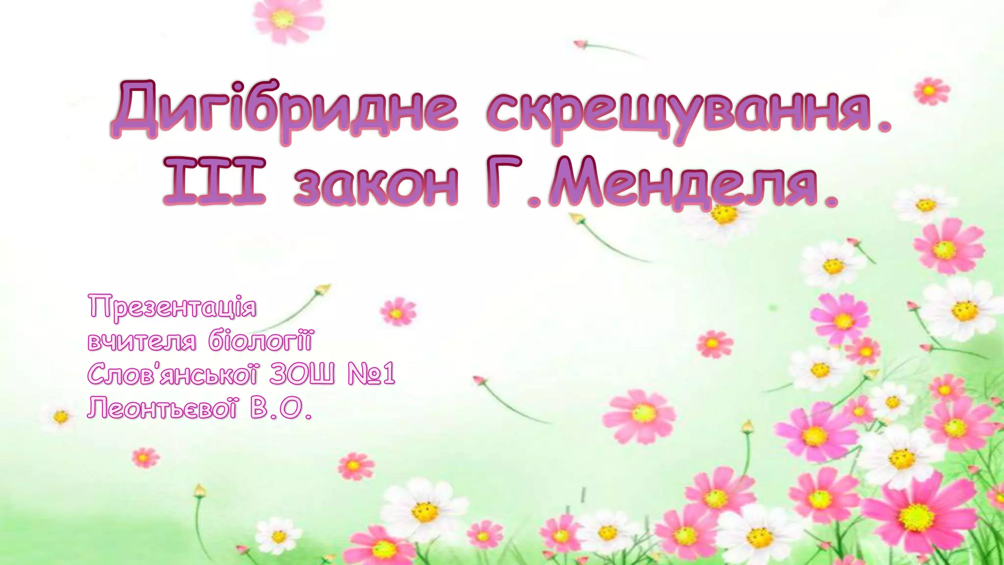 Презентація є дидактичним матеріалом для уроку біології в 9 класі на тему "Дигібридне схрещування. ІІІ закон Г.Менделя". Можливе використання даної презентації і на уроці біології в 10 класі для повторення.