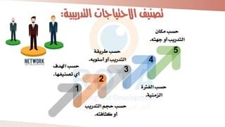 يتناول الوثيقة تصميم الحقائب التدريبية وفقًا لاحتياجات التدريب المختلفة، حيث تصنف تلك الاحتياجات بناءً على عدة عوامل مثل الحجم، الكثافة، الزمن، والمكان. تهدف الوثيقة إلى توفير أساليب وطرق تدريبية فعالة تلبي الاحتياجات الفردية والتنظيمية، مع التأكيد على أهمية التقييم المستمر لأداء البرامج التدريبية. تتضمن الوثيقة أيضًا استراتيجيات لتحديد الأهداف والتكاليف اللازمة لتنفيذ التدريب بشكل مثالي.