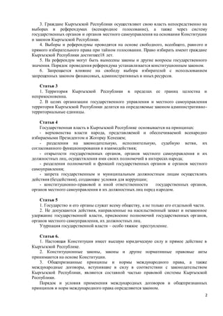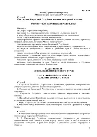Проект закона Кыргызской Республики о Конституции определяет основы государственного устройства, провозглашает Кыргызстан независимым и демократическим государством, основанным на принципах народовластия. Документ включает положения о защите прав человека, разделении властей, а также о социальном и экономическом развитии. В нем также предусмотрены гарантии прав собственности и защита культурного наследия народа.