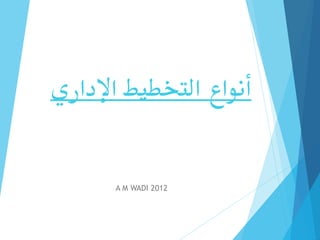 يتناول هذا الوثيقة أنواع التخطيط الإداري وفقًا للأغراض المختلفة التي تستخدمها المنظمات، بما في ذلك التخطيط الاستراتيجي، التكتيكي، والتشغيلي، وتصنيفها حسب المدى الزمني والوظيفة. يوضح الوثيقة أيضًا أهمية التخطيط وخصائصه، مثل المرونة والواقعية في التقديرات. كما يعرض أشكال مختلفة من التخطيط، مثل تخطيط الإنتاج والتخزين والموارد البشرية.