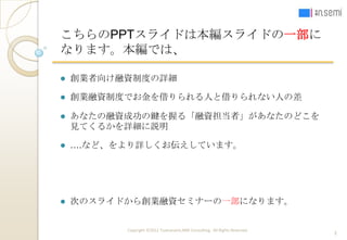 政策金融公庫勤続26年 元融資課長が起業家の共有の悩みである「事業資金」を調達する方法をお伝えします。続きの動画はこちらから→http://kikaku-keiei.com/sougyoyuushi.html 起業オンラインセミナーは、起業家、経営者の方のために、特定の分野についての知識やノウハウが学べるオンラインの動画セミナーです。 起業オンラインセミナーは、外部の講師を招いてテーマ毎に専門のプロがあなたの抱えている疑問や課題を解決します。