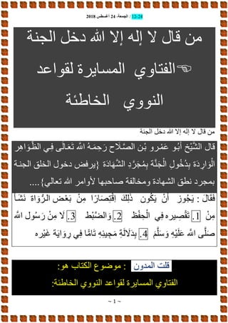 تتناول الوثيقة أحكام الفتاوى والممارسات الإسلامية المتعلقة بالجنة وأهمية التقيد بالتعاليم الدينية. تؤكد على أن الدخول إلى الجنة مشروط بالإيمان والعمل الصالح، مع الإشارة إلى بعض الأحاديث النبوية المتعلقة بهذا الموضوع. كما تتناول النصوص المختلفة المتعلقة بالأحكام الشرعية في حياة المسلمين.
