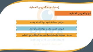 تستعرض الوثيقة استراتيجيات تصميم حقائب التدريب في شركة المتعلم، بما في ذلك أسس اختيار استراتيجيات التعليم ومواردها. كما تتناول استراتيجيات التعليم للمجموعات وكيفية تنفيذها بشكل فعّال.