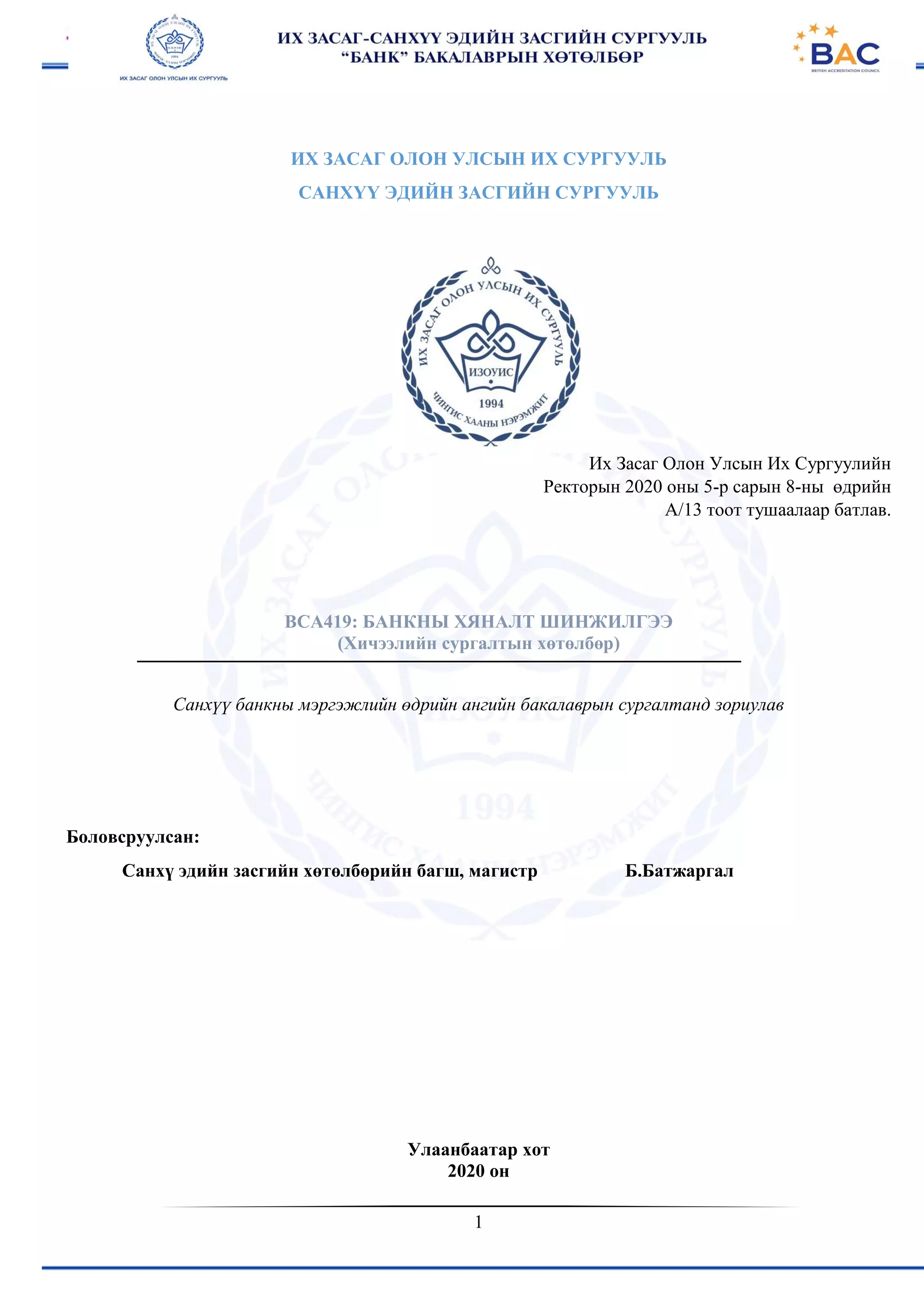 ХИЧЭЭЛИЙН СЕМИНАРЫН СУРГАЛТЫН ҮЙЛ АЖИЛЛАГА Семинар явуулах арга: Практик ажилтантай уулзах Энэ арга нь амьдрал дээр хууль эрх зүйг хэрхэн ашиглаж хэрэглэдэг талаар оюутнуудад маш чухал мэдээлэл өгдөг. Гэхдээ практик ажилтанг зөв сонгох, оюутнуудыг бэлдэх, уулзалтыг дүгнэх зэрэрт анхаарлаа хандуулахгүй бол хичээлийн чанар үр дүнд сөрөг нөлөө үзүүлдэг гэдгийг мартаж болохгүй. Кейс судлах Оюутнуудыг шүүгч, нэхэмжлэгч, хариуцагч, өмгөөлөгч нарыг төлөөлсөн байдлаар хуваана. Мөн тодорхой шийдэл үндэслэлийн дагуу жижиг бүлгүүд ч болгож болно. Кейс нь ихэвчлэн амьдрал дээр болж өнгөрсөн хэрэг байх ба оюутнуудын гаргасан санал дүгнэлтийг сонссоны дараа багш шүүхээс ямар шийдвэрийг юун дээр үндэслэж гаргасныг тайлбарлаж өгнө. Асуулт, хариулт Багш асуултыг бэлтгэхдээ тухайн хичээлийн агуулгыг илэрхийлж чадахуйц хэмжээнд хийнэ. Энэ аргыг үр дүнтэй хэрэглэхийн тулд хичээлийн төгсгөлд бүхий л шаардлагатай гэсэн асуулт хаиултыг тэмдэглэсэн жагсаалт гаргана. Гол нь багшийн зүгээс аль нэг оюутан бүх л хичээлийн туршид давамгайлан оролцохоос урьдчилан сэргийлэх нь зүйтэй юм. Оюуны довтолгоо Оюуны довтолгоо гэдэг нь суралцагчид үзэл бодлоо чөлөөтэй илэрхийлэх явдлыг урамшуулах арга юм. Энэ нь оюутан шүүмжлэлээс айхгүйгээр бүтээлч санаа бодож олох, илэрхийлэхийг урамшуулдагаараа ач холбогдолтой. Энэ үед багш оюутнуудыг тухайн асуудлаар аль болох олон төрлийн санааг чадах хэмжээгээрээ гаргахыг хүсч, бүх санааг самбарын юм уу тусгайлан бэлтгэсэн хүснэгт дээр тэдгээрийн буруу зөвийн харгалзахгүйгээр бичнэ. Хэрэв хариултын явцад жинхэнэ оновчтой хариулт гарч ирэхгүй байвал түүнийг тодруулан засч болно. Бүх санааг бичиж дуусах хүртэл ямар нэг шүүмжлэлийг багш хийхгүй байх ёстой. Эцэст нь уг санаануудыг шүүмжлэн ярилцаж төрөлжүүлэн ангилж болно. Бусад арга Оюутны бүтээлч байдлыг идэвхижүүлэх бүх төрлийн арга байж болно. Семинар №1. Сэдэв: Банкны хяналт шалгалтын тухай ойлголт Семинарын зорилго: “Банкны хяналт шинжилгээ” хичээлээр банкны үйл ажиллагааны талаархи олсон онолын мэдлэгт тулгуурлан банк санхүүгийн байгууллагын талаархи бодит мэдээлэл хэрхэн гаргаж ашиглаж байгаа, банкны хяналт, шалгалтын хийж гүйцэтгэж байгаа арга барилын талаар оюутан сурагч нарт зохих түвшны мэргэжлийн мэдлэг олгоход оршино. Семинар №1 сургалтын хүрээнд Монгол улс дахь банк санхүүгийн салбарт улс төр, засгийн газраас банк санхүүгийн зүгээс нөлөөлөл үзүүлэх боломж. Хяналт, шалгалтын онцлох зүйлийн талаар үзэх болно. Семинарын агуулга: 1. Хяналтын үйл ажиллагааны онцлог 2. Шалгалтын үйл ажиллагааны онцлог