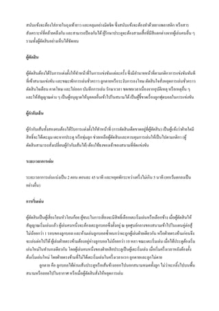 หรือสาร สังเคราะห์ที่คล้ายคลึงกัน และสามารถป้ องกันได้ผู้รักษาประตูจะต้องสวมเสื้อที่มีสีแตกต่างจากผู้เล่นคนอื่น ๆ รวมทั้งผู้ตัดสินอย่างเห็นได้ชัดเจน ผู้ตัดสิน ผู้ตัดสินต้องได้รับการแต่งตั้งให้ทาหน้าที่ในการแข่งขันแต่ละครั้ง ซึ่งมีอานาจหน้าที่ตามกติกาการแข่งขันทันที ที่เข้าสนามแข่งขัน และขณะพักการเล่นชั่วคราว ลูกตายหรือระงับการลงโทษ ตัดสินใจสั่งหยุดการเล่นชั่วคราว ตัดสินใจเตือน คาดโทษ และไล่ออก บันทึกการเล่น รักษาเวลา ชดเชยเวลาเนื่องจากอุบัติเหตุ หรือเหตุอื่น ๆ และให้สัญญาณต่าง ๆ เป็นผู้อนุญาตให้บุคคลอื่นเข้าไปในสนามได้เป็นผู้ชี้ขาดเรื่องลูกฟุตบอลในการแข่งขัน ผู้กากับเส้น ผู้กากับเส้นทั้งสองคนต้องได้รับการแต่งตั้งให้ทาหน้าที่ (การตัดสินเด็ดขาดอยู่ที่ผู้ตัดสิน) เป็นผู้แจ้งว่าฝ่ายใดมี สิทธิ์จะได้เตะมุม เตะจากประตู หรือทุ่มลูก ช่วยเหลือผู้ตัดสินและควบคุมการเล่นให้เป็นไปตามกติกา (ผู้ ตัดสินสามารถสั่งเปลี่ยนผู้กากับเส้นได้) ต้องใช้ธงของเจ้าของสนามที่จัดแข่งขัน ระยะเวลาการเล่น ระยะเวลาการเล่นแบ่งเป็น 2 ตอน ตอนละ 45 นาที และหยุดพักระหว่างครึ่งไม่เกิน 5 นาที (ยกเว้นตกลงเป็น อย่างอื่น) การเริ่มเล่น ผู้ตัดสินเป็นผู้เสี่ยงโยนหัวโยนก้อย ผู้ชนะในการเสี่ยงจะมีสิทธิ์เลือกเตะเริ่มเล่นหรือเลือกข้าง เมื่อผู้ตัดสินให้ สัญญาณเริ่มเล่นแล้ว ผู้เล่นคนหนึ่งจะต้องเตะลูกบอลซึ่งตั้งอยู่ ณ จุดศูนย์กลางของสนามเข้าไปในแดนคู่ต่อสู้ ไม่น้อยกว่า 1 รอบของลูกบอล และห้ามเล่นลูกบอลซ้าจนกว่าจะถูกผู้เล่นฝ่ายเดียวกัน หรือฝ่ายตรงข้ามก่อนจึง จะเล่นต่อไปได้ผู้เล่นฝ่ายตรงข้ามต้องอยู่ห่างลูกบอลไม่น้อยกว่า 10 หลา ขณะเตะเริ่มเล่น เมื่อได้ประตูต้องเริ่ม เล่นใหม่ในทานองเดียวกัน โดยผู้เล่นคนหนึ่งของฝ่ายเสียประตูเป็นผู้เตะเริ่มเล่น เมื่อเริ่มครึ่งเวลาหลังต้องตั้ง ต้นเริ่มเล่นใหม่ โดยฝ่ายตรงข้ามที่ไม่ได้เตะเริ่มเล่นในครึ่งเวลาแรก ลูกตายและลูกไม่ตาย ลูกตาย คือ ลูกบอลได้ผ่านเส้นประตูหรือเส้นข้างออกไปนอกสนามหมดทั้งลูก ไม่ว่าจะกลิ้งไปบนพื้น สนามหรือลอยไปในอากาศ หรือเมื่อผู้ตัดสินสั่งให้หยุดการเล่น